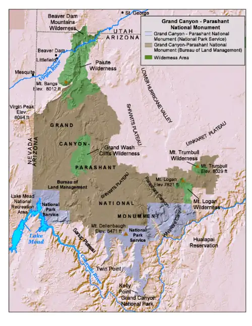 Het gebied is een veilige habitat voor de bedreigde gevlekte bosuil en de kritieke Californische condor waarvan herintroductie hier plaatsvond. In het gebied zijn vier wildernisgebieden afgebakend beschermd door de Wilderness Act en opgenomen in het National Wilderness Preservation System; Mount Trumbull Wilderness, Mount Logan Wilderness, Grant Wash Cliffs Wilderness en Paiute Wilderness.