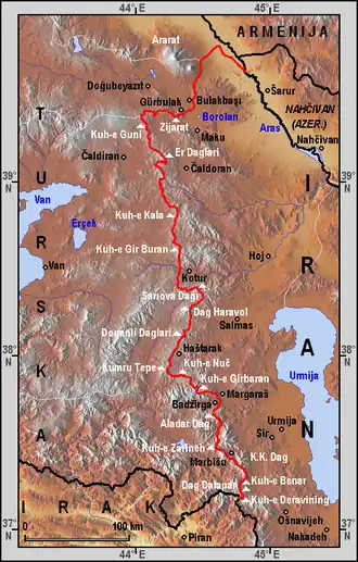 De grenslijn ligt hoofdzakelijk in noord-zuid richting, gedeeltelijk op de waterscheiding tussen het Turkse Vanmeer en het Iraanse Urmiameer, twee grote meren. In het noorden eindigt de grens op het drielandenpunt van de twee staten met Azerbeidzjan, meer bepaald zijn exclave Nachitsjevan, en in het zuiden op de grensdriehoek met Irak, meer bepaald de Koerdische Autonome Regio.