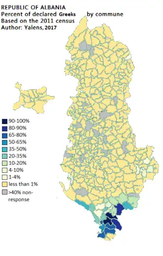 In de volkstelling van 2011 verklaarden 24.243 personen zich als etnische Grieken, hetgeen 0,87% van de Albanese bevolking is.[1] Dit aantal ligt waarschijnlijk hoger, aangezien de Griekse minderheid te kampen heeft met gemengde huwelijken, culturele assimilatie en hoge emigratiecijfers. Bovendien boycot een groot deel van de Griekse bevolking regelmatig de bevolkingscensussen.[2] Bijna de helft van de Grieken woont in prefectuur Vlorë (12.079 personen), gevolgd door Gjirokastër (5.363 personen) en Korçë (2.923 personen).