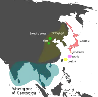 | Verspreidingsgebied van de geelbrauwvliegenvanger (F. narcissius) en de groenrugvliegenvanger (F. elisae) | |||||||||||||