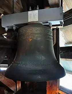 De middelste luidklok, in toonhoogte F. Rechts is een deel van de kleine luidklok, de 'Papklok' in toonhoogte G te zien. -