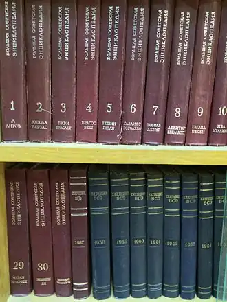 - Great Soviet encyclopedia, ed. A.M. Prokhorov (New York: Macmillan, London: Collier Macmillan, 1974–1983) 31 delen, drie indexdelen. Vertaling van de derde Russische editie van Bol'shaya sovetskaya entsiklopediya