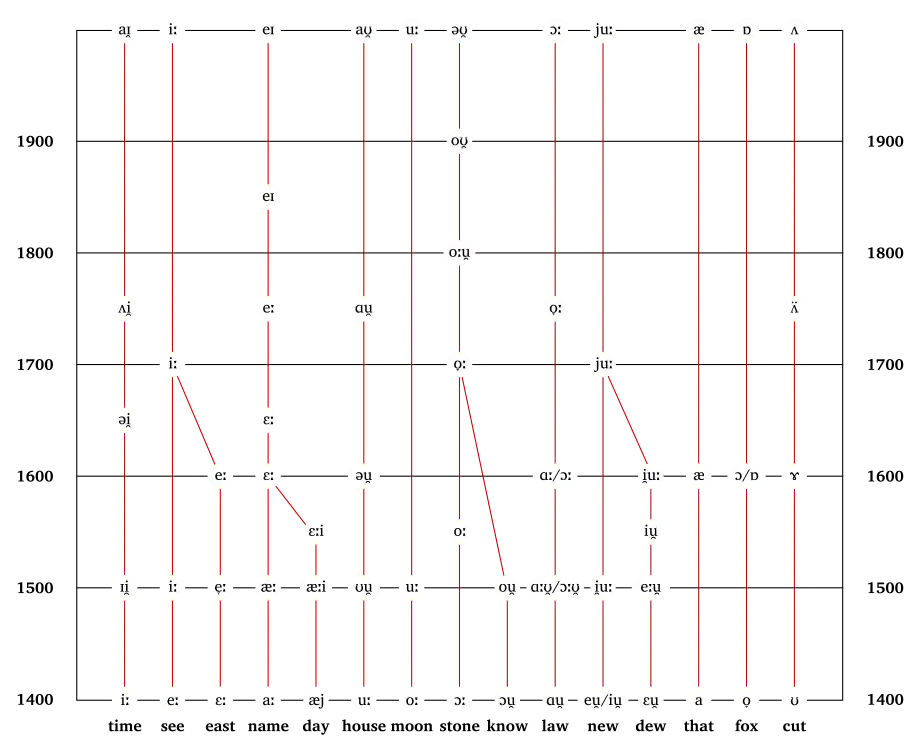 - De [eː] van het Middelengels veranderde in de [iː] van het moderne Engels (zoals in feet).