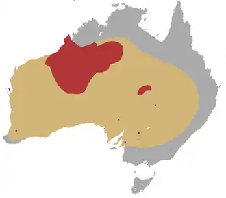 die voorkomt in Australië. Oorspronkelijk kwam dit dier in vrijwel het gehele Australische binnenland voor, maar nu alleen nog maar in Zuidwest-Queensland, het grensgebied van het Noordelijk Territorium en West-Australië en de Kimberley. Soms worden er tot zes ondersoorten erkend.