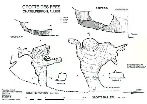 - Dit artikel of een eerdere versie ervan is een (gedeeltelijke) vertaling van het artikel Grotte des Fées (Châtelperron) op de Franstalige Wikipedia, dat onder de licentie Creative Commons Naamsvermelding/Gelijk delen valt. Zie de bewerkingsgeschiedenis aldaar.