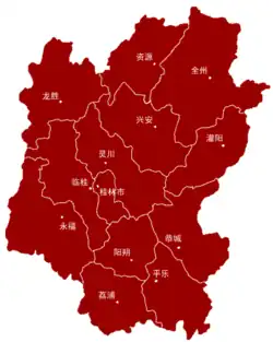 - ↑ Guăngxī (China): Prefectural Division & Major Cities - Population Statistics, Maps, Charts, Weather and Web Information. www.citypopulation.de. Geraadpleegd op 10 juli 2025.