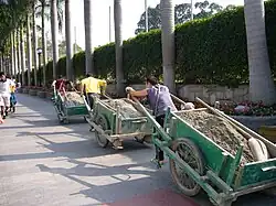 Het verkeer op het eiland gaat te voet. Er is geen particulier autoverkeer, wel een politieauto, een brandweerwagen en een ambulance. Ook fietsen zijn niet toegestaan. Voor de toeristen zijn er enkele kleine elektrische wagentjes, die van de veerboot naar de hotels rijden. De bevolking loopt alles. Lichtere zaken worden met een bamboe-juk gedragen, grote hoeveelheden gaan per handkar evenals bouwmaterialen.