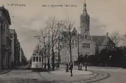Het Haganum rond 1910, gezien vanaf de Zoutmanstraat. De tram reed toen al voor de school langs.
