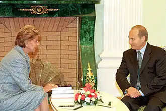 - ↑ Hélène Carrère d'Encausse ontmoette Poetin diverse malen en verdedigde in Frankrijk zijn politiek, inclusief de annexatie van de Krim. Op 23 februari 2023 verscheen een video-interview met haar, waarin ze werd gevraagd of Poetin Oekraïne zou binnenvallen. Zij was van mening dat dat niet zou gebeuren; "Poetin is geen idioot". De volgende dag viel Rusland Oekraïne binnen.[2]