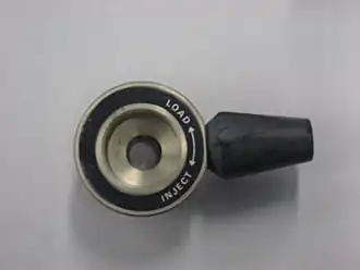 Het model met de injectie-ingang aan de knop-zijde is te prefereren als men een kleine hoeveelheid monster tot zijn beschikking heeft. Zo wordt het monster dichter bij de loop geïnjecteerd, wat minder verlies oplevert. Met de knop kan de kraan in 2 standen worden gedraaid, de load- of de inject-stand.