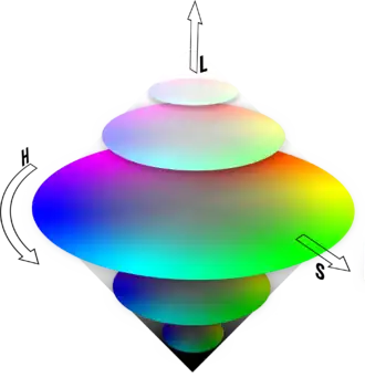 - Een HSL-kleur heeft de waarden H ∈ [0, 360], S ∈ [0, 1] en L ∈ [0, 1].