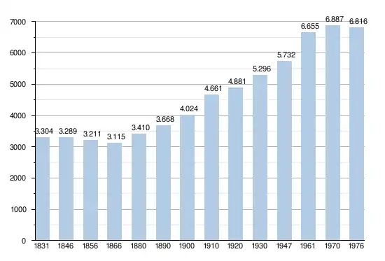 - Bronnen:NIS, Opm:1831 t/m 1970=volkstellingen;1976=inwonertal op 31 december