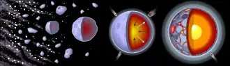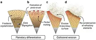 Tijdens accretie bereikten sommige objecten de grootte van planetesimalen. Binnenin deze objecten kwam warmte vrij door radioactief verval en door de energie die bij botsingen en inslagen vrijkwam. De temperatuur in het binnenste van een planetesimaal is voldoende om metalen als ijzer en nikkel te smelten. Omdat het relatief zwaar is, konden kleine druppeltjes gesmolten metaal vervolgens naar de kern percoleren. Zo raakten de silicaten gescheiden van zwaardere siderofiele metalen. Binnenin de planetesimaal ontstonden een in metalen verrijkte kern en een erin verarmde mantel van silicaten. Bij inslagen van ongedifferentieerde objecten werd het materiaal aan de mantel toegevoegd. Het nieuwe materiaal raakte verhit zodat ook hiervan de metaalfractie naar de kern percoleerde. Dit proces van planetaire differentiatie zorgde voor het ontstaan van een metallische kern in de proto-Aarde. Een ander gevolg was de lage hoeveelheid siderofiele elementen in de aardmantel en -korst ten opzichte van (ongedifferentieerde) chondrieten.