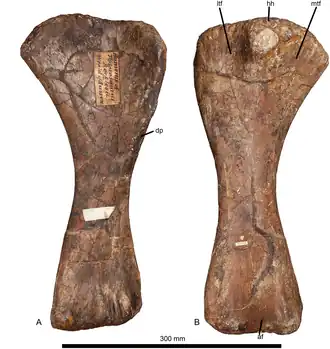 Het opperarmbeen heeft een lengte van 599 millimeter. Het is robuust gebouwd. De bovenrand is sterk verruwd, een teken dat die bedekt was met een dikke laag kraakbeen. De buitenzijde van de bovenkant maakt een duidelijke hoek, een afgeleid kenmerk dat typisch is voor Titanosauriformes. Het bovendeel is in zijaanzicht niet S-vormig gebogen, een basaal kenmerk. Aan de achterzijde van de bovenkant bevindt zich een lage bult.