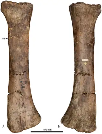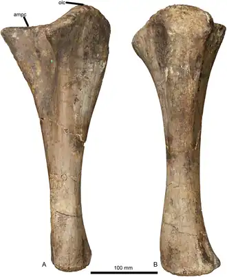 De ellepijp heeft een lengte van 421 millimeter en is robuust gebouwd. Het is 146 millimeter breed aan de binnenste bovenkant. Dit weerspiegelt een forse processus olecrani achteraan, de aanhechting voor de musculus triceps brachii. De spitse voorste uitsteeksels maken een hoek met elkaar van 80°. Het uitsteeksel nog achter de processus olecrani is kort. Onderaan is de ellepijp licht verbreed, een basaal kenmerk.