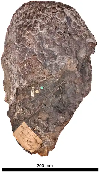 Het specimen NHMUK R1868 vertegenwoordigt de eerste huidafdrukken die ooit van sauropoden gevonden zijn. In 2004 opperde Upchurch dat de afdrukken die van beenschubben of osteodermen waren; in 2015 was hij weer van mening veranderd en concludeerde dat het om normale hoornschubben ging. Een oppervlakte van 195 bij 215 millimeter wordt bedekt door talloze zeshoekige niet-overlappende schubben met een doorsnede van tussen de tien en vijfentwintig millimeter. Opliggende kleinere schubben op de grote schubben zijn niet waarneembaar. De schubben graderen van groot naar klein: het kan zijn dat de kleinere schubben precies op het ellebooggewricht lagen en daaraan zo een grotere beweeglijkheid gaven. De schubben zijn bol zoals ze bewaard zijn gebleven. Steel beargumenteerde daaruit dat ze in het echt hol moeten zijn geweest daar het immers afdrukken waren. In 2015 achtte men het waarschijnlijker dat het in feite om natuurlijke afgietsels gaat van oorspronkelijk bolle schubben. De schubben lijken sterk op huidafdrukken die bij latere vondsten van sauropoden gedaan zijn.