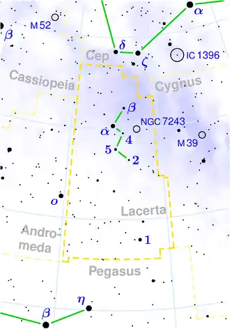 Het sterrenbeeld heeft geen heldere sterren, de helderste, alpha Lacertae, heeft magnitude 3,77.