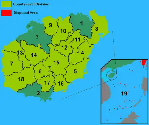 | 16 | Lingshui (Li) | 陵水黎族自治县 | Língshuǐ Lízú Zìzhìxiàn | ||||