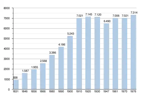 - Bronnen:NIS, Opm:1831 tot en met 1970=volkstellingen, 1976= inwoneraantal op 31 december