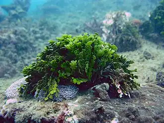 Hoewel grotendeels werd aangenomen dat de overvloed op riffen te wijten is aan het feit dat het onaantrekkelijk is voor herbivoren, hebben recentere studies aangetoond dat Halimeda in feite onderhevig is aan begrazing door sommige herbivoren zoals Scarus rivulatus, Hipposcarus longiceps en Chlorurus microrhinos. Bedekking van hard koraal kan zelfs een sleutelrol spelen bij het in stand houden van de biomassa van Halimeda op riffen, aangezien uit een onderzoek bleek dat thalli die onder het bladerdak van Acropora-kolonies groeiden groter waren dan die in open gebieden die werden blootgesteld aan herbivoren