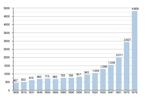 - Bronnen:NIS, Opm:1806 tot en met 1970=volkstellingen; 1976 = inwoneraantal op 31 december