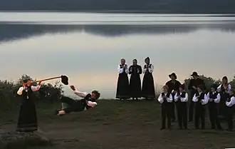 Traditioneel was deze dans een manier voor jonge mannen om indruk te maken, en werd hij gedanst op bruiloften en dergelijke feesten. Het ritme van de dans is een 2/4 of 6/8 maat. Omdat de dans nogal snel is en een scherpe puls heeft zijn ervaren musici nodig om hem goed uit te voeren. De musicus moet de dansers genoeg energie geven om diverse gedurfde bewegingen en sprongen uit te voeren zoals de “nakkespretten”, “krukinger”, “hodestifter” en in het bijzonder de “kastet” (vert: 'worp'). “Kastet” wordt gezien als proeve van kracht, en deze beweging bevat ook het aftrappen van een hoed van een houten stok die zich ongeveer op een hoogte van 230 tot 280 cm boven de vloer bevindt.