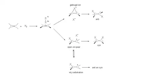 In de eerste stap van de reactie nadert een halogeen molecuul de elektronenrijke C=C dubbele binding. Het halogeen atoom dat zich het dichtst bij de C=C binding bevindt, wordt partieel positief geladen omdat zijn elektronen worden afgestoten door de π-elektronen van de dubbele binding. Dit halogeenatoom is nu elektrofiel en wordt vervolgens door de π-elektronen van de C=C dubbele binding aangevallen. Eén, twee of drie tussenproducten kunnen ontstaan, een positief gebrugd ion, een open ionpaar en/of een vrij carbokation; in alle gevallen blijft een halogenide-ion over. De aard van het gevormde eindproduct hangt af van de relatieve stabiliteit van het tussenproduct. De anti-additie van halogeen aan 2-buteen is alleen te verklaren met behulp van het gebrugde ion als tussenproduct. Bij additie van broom wordt dat tussenproduct bromoniumion genoemd. Dit gebrugde ion lijkt verreweg het stabielst in dit geval.
