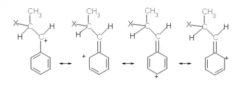 Bij de additie van broom aan trans-1-fenylpropeen is er enige syn-additie, de stabiliteit van het bromoniumion lijkt niet veel groter dan die van het open ionpaar en/of het vrije carbokation. Bij de additie van chloor is de mate van syn-additie nog groter en mag geconcludeerd worden dat de stabiliteit van open ionpaar en/of het vrije carbokation, in vergelijking met die van het gebrugde ion, nog meer is toegenomen. Deze toename van stabiliteit wordt onder meer toegeschreven aan het effect van conjugatie bij het carbokation.[2] Bij het carbokation is sprake van mesomerie, zie figuur 5.