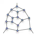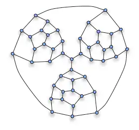 elk hamiltoncircuit het fragment moet binnengaan en verlaten via de bovenste knoop en een van de onderste twee; het kan niet langs een van de onderste knopen binnengaan en langs de andere buitengaan en toch het ganse fragment aandoen. Wanneer nu drie van deze fragmenten gecombineerd worden in een graaf als volgt: