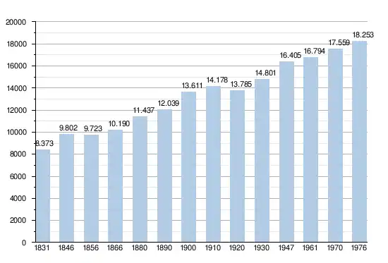 - Bronnen:NIS, Opm:1831 t/m 1970=volkstellingen;1976=inwonertal op 31 december