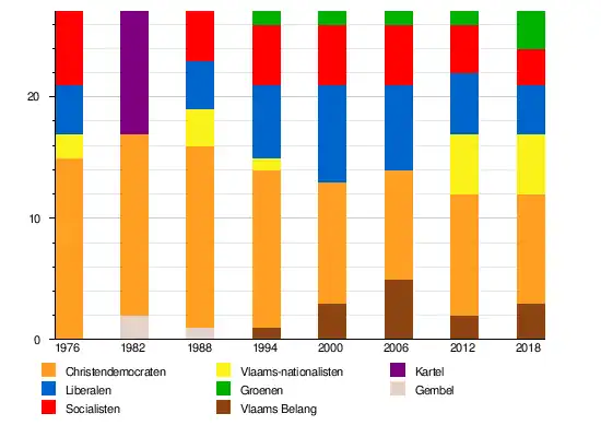 De zetels van de gevormde coalitie staan vet afgedrukt. De grootste partij is in kleur. Bronnen: 1976-2000: Verkiezingsdatabase Binnenlandse Zaken // 2006-2012: gva.be