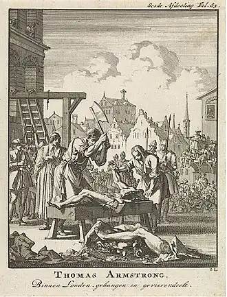 Generaal-majoor Thomas Harrison werd in oktober 1660 verschillende minuten opgehangen en voordat hij ontdarmd zou worden trapte hij zijn beul, waarop die hem snel onthoofdde. Zijn vonnis luidde: