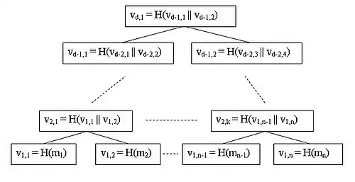 Een hash-boom is vaak een binaire boom. Dit houdt in dat iedere knoop twee knopen onder zich heeft. Het is wel mogelijk om een hash tree te maken met meer knopen onder iedere knoop. Om een hash tree te maken beginnen we onderaan, bij de bladeren van de boom. We hakken het bericht in stukken en elk stuk zetten we om in een hashwaarde met behulp van een hashfunctie . Elk blaadje krijgt dus de hashwaarde . De knopen kunnen we bepalen door de hashwaarde van de twee knopen en om te zetten in een nieuwe hashwaarde . Zo wordt de hele boom opgebouwd tot de topknoop . Deze topknoop is de belangrijkste knoop van de boom en wordt opgestuurd door een betrouwbare bron. De ontvanger kan beginnen met downloaden van de gegevensblokken nadat hij de topknoop binnen heeft gekregen.