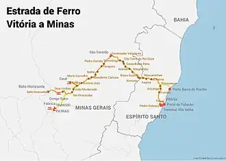 De Estrada de Ferro Vitória a Minas (EFVM) is een spoorweg die de ertsterminal verbindt met de mijnen in Minas Gerais.[2] De spoorlijn heeft een lengte van 905 kilometer en Vale heeft een concessie om de spoorlijn te beheren tot 2027.[2] Over ongeveer twee derde van de totale lengte is er dubbelspoor en de spoorlijn van daarmee continue in twee richtingen worden gebruikt. Veel van de capaciteit wordt gebruikt voor het transport van ijzererts van Vale, maar ook andere bedrijven maken gebruik van de spoorlijn.