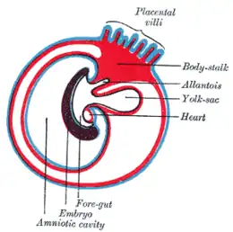Menslijk embryo 2,6 mm lang. Body-stalk=hechtsteel, Yolk-sac=dooierzak -