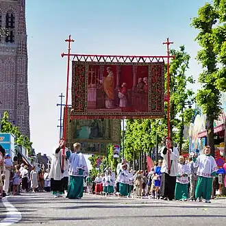 - Het tweede deel van de processie verbeeldt de Heilige Mis. Dit gedeelte weerspiegelt de centrale rol van de mis in het geloofsleven en illustreert de religieuze ceremonie met symbolische elementen en liturgische voorwerpen.