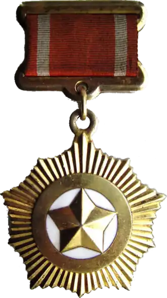 De onderscheiding is een tienpuntige ster met gouden stralen aan een klein rood lint met twee witte strepen en gouden gespen aan boven- en onderzijde. In het midden van de ster is een gouden vijfpuntige ster op een rond wit medaillon uitgespaard.