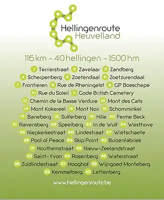 Hellingenroute Heuvelland is een fietstocht over 40 hellingen met start in Kemmel, Heuvelland. De route telt 1500 hoogtemeters en dit over 115 kilometer. De Hellingenroute wordt éénmaal per jaar als event georganiseerd en dit telkens op 15 augustus.