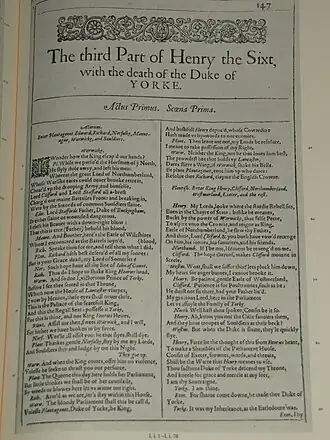 Titelpagina van The Third Part of Henry the Sixt, with the death of the Duke of Yorke in de First Folio, 1623.