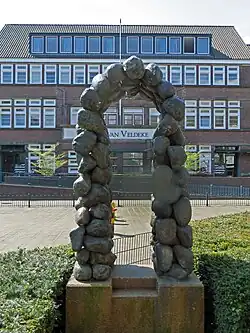 Vóór het voormalige schoolgebouw bevindt zich sinds 1998 een monument dat oorspronkelijk bedoeld was als herinnering aan het Veldekecollege. Het uit Maaskeien opgebouwde poortje is een ontwerp van kunstenaar Hans Lemmen, waarbij de keien hoofden van leerlingen verbeelden, die door de poort in- en uitgaan. Op een bronzen plaquette staan de namen van oud-leerlingen, die hadden ingetekend op een in 1998 verschenen boek over de school.[4] In 2019 werd door de Stichting Veldeke Memorial een tweede plaquette toegevoegd met een tekst die verwijst naar de topontmoeting tussen de geallieerde legerleiders, die hier op 7 december 1944 plaatsvond.[noot 3] Daarmee kreeg het monument een andere betekenis.[6]