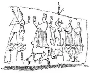 Centraal reliëf gebeeldhouwd onder koning Tudhaliya IV (1240-1215 v.C). Van links naar rechts: de stormgod van de Hurrieten Teshub op twee berggoden, de Hurriteische zonnegodin Hebat (ook wel bekend als Aruna of Arinna) op een katachtige, hun zoon Sharruma op een katachtige, twee vrouwelijke godinnen op een tweekoppige adelaar.