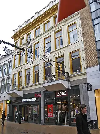 Het pand Herestraat 52 (boven de winkelpui) te Groningen anno 2012