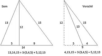 | 5,29,30 | 72 | 10,13,13 | 60 | gelijkbenig: 2 x 5,12,13 | 13,20,21 | 126 | 4∙(3,4,5) + 5,12,13 | |
