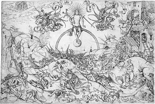 Het stelt de Dag des oordeels voor met Christus tronend op de hemelboog. Hij is afgebeeld met zwaard en lelie, symbolen van rechtvaardigheid en barmhartigheid. Daaronder is in een landschap het gevolg van het oordeel van Christus afgebeeld: de scheiding van de uitverkorenen en de verdoemden. De zielen van de uitverkorenen worden door engelen begeleid naar een heuvelachtig landschap links. Het overige deel van het landschap wordt ingenomen door de verdoemde zielen, die door demonen worden belaagd en onder meer worden gebruikt als trekdieren. Helemaal rechts is een brandende helleburcht te zien. Links worden verdoemden geroosterd en gerookt onder het toeziend oog van een kluizenaar.