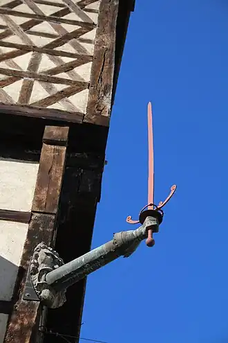 Dit is een van de meest bekende huizen van Hasselt, omdat het een zeer rijk vakwerkhuis is in Maaslandse stijl. Het is vernoemd naar een uithangbord, dat een zwaard toont in een gehandschoende vuist. Dit was het symbool van de apothekers.