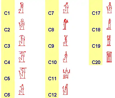 De lijst die Alan Gardiner maakte worden de hiërogliefen gegroepeerd naar thema, zoals goden. De tekens in zo'n groep worden genummerd, bijvoorbeeld: C1, C2, C3, C4.