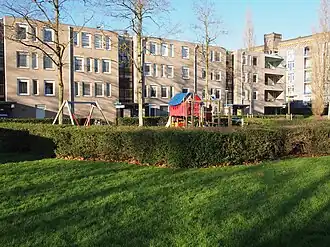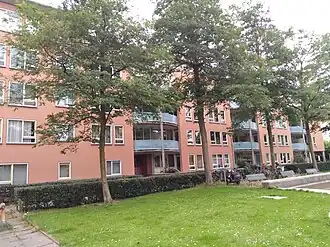 De oostelijke en gevelwanden van het plein werden volgebouwd met woningen, onder andere ontworpen door Lucien Lafour en Frans van Dillen. De huizen hebben zachte vormen en tinten. Destijds werden ze door Het Parool lichtvoetig, eenvoudig en speels genoemd, on-hollands. Nadruk werd gelegd op de roze woningen met blauwe balkons. [1] Huisnummers lopen daarbij op van 3 tot en met 120, al ontbreken hier en daar wat huisnummers.