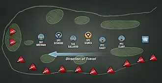 - Bij een colonne van twintig tanks op een smalle weg laat een aanvalsgroep met draagbare raketwerpers veelal de voorste voertuigen door. Als bijvoorbeeld de zesde tank vanuit de hinderlaag vernietigd wordt, blokkeert deze de weg, zodat de colonne in tweeën gedeeld wordt, waarbij twee derde afgesneden is van de commandant die gewoonlijk in een van de voorste tanks zit. Dit leidt vaak tot chaos bij de verdedigers. Afhankelijk van het resultaat van de aanval kan de hinderlaaggroep daarna de rest van de colonne onder vuur nemen of de aftocht kiezen.