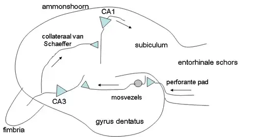 Er lopen in de hippocampus drie belangrijke excitatoire vezelverbindingen. Dit zijn achtereenvolgens de tractus perforans (in de afbeelding 'perforante pad'), de mosvezels en de collateraal van Schaffer.[6] De afferente vezels van de tractus perforans lopen vanuit het subiculum naar de dendrieten van de korrelcellen in de gyrus dentatus. De axonen van deze korrelcellen maken vervolgens als mosvezels synaptische contacten met de dendrieten van de piramidecellen in CA3. De axonen van de piramidecellen van CA3 splitsen zich in twee richtingen. De axonen van het ene deel verlaten de hippocampus via een uitstulping aan het bovenzijde van de hippocampus, de zogeheten fimbria. De axonen van het andere deel, die gezamenlijk de collateraal van Schaffer wordt genoemd, projecteren naar de piramidecellen van CA1 in de Ammonshoorn. CA1-axonen projecteren ten slotte naar het subiculum. Het verschijnsel langetermijnpotentiëring of LTP is aangetoond door de collateraal van Schaffer elektrisch te prikkelen en de reactie hierop, in de vorm van een toename van de excitatoire synaptische potentiaal, in gebied CA1 te meten. Diverse neurotransmitters zoals acetylcholine, dopamine, serotonine en noradrenaline bereiken de hippocampus via circuits die langs de fornix en het subiculum, de cortex entorhinalis binnendringen.