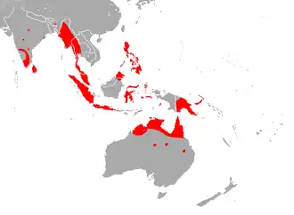 In Australië komt de soort voor in het uiterste noorden van West-Australië (Kimberley), de noordelijke helft van het Noordelijk Territorium en op het Kaap York-schiereiland en omliggende gebieden (Queensland). De soort is enkele malen gevangen in Midden-Queensland en het zuiden van het Noordelijk Territorium, buiten de "normale" verspreiding.[5] Op Nieuw-Guinea is de soort slechts op drie plaatsen gevangen, alle drie gelegen in Papoea-Nieuw-Guinea.[6] In de omgeving van Nieuw-Guinea is de soort gevonden op Ambon, de Aru-eilanden, Biak en Supiori, Buru, Ceram, Halmahera, Japen, Kairiru, Morotai, Nieuw-Brittannië, Nieuw-Ierland en Woodlark. Mogelijk komt hij ook voor op de Sangihe- en Talaud-eilanden.[3] In de Filipijnen is de soort gevonden op Balabac, Bohol, Catanduanes, Leyte, Luzon, Marinduque, Maripipi, Mindanao, Negros en Palawan.[4]